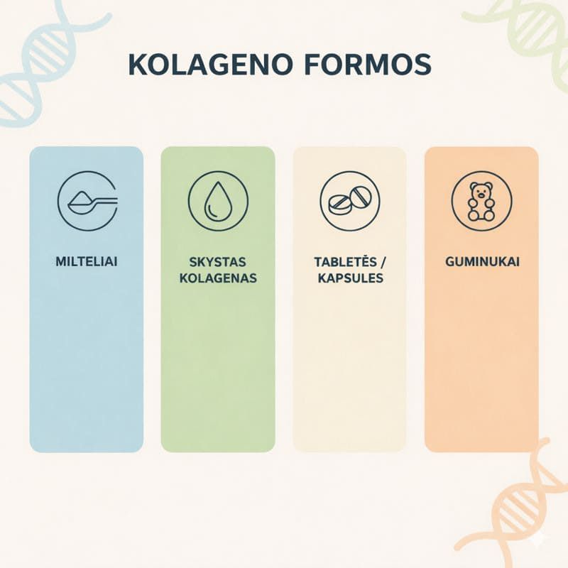 • Tabletės ir kapsulės - patogios kasdieniam vartojimui, tačiau dažnai turi mažesnį kolageno kiekį vienoje porcijoje.